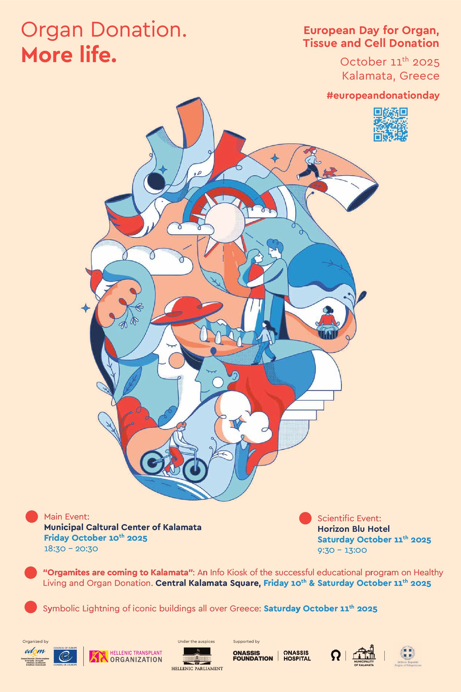 Ve dnech 10.–12. října 2025 se Kalamata a Athény stanou centrem oslav Evropského dne dárcovství. Tento významný den, pořádaný každoročně v jiné zemi pod záštitou EDQM – Rady Evropy, upozorňuje na důležitost dárcovství orgánů, tkání a buněk a na sílu lidské solidarity.